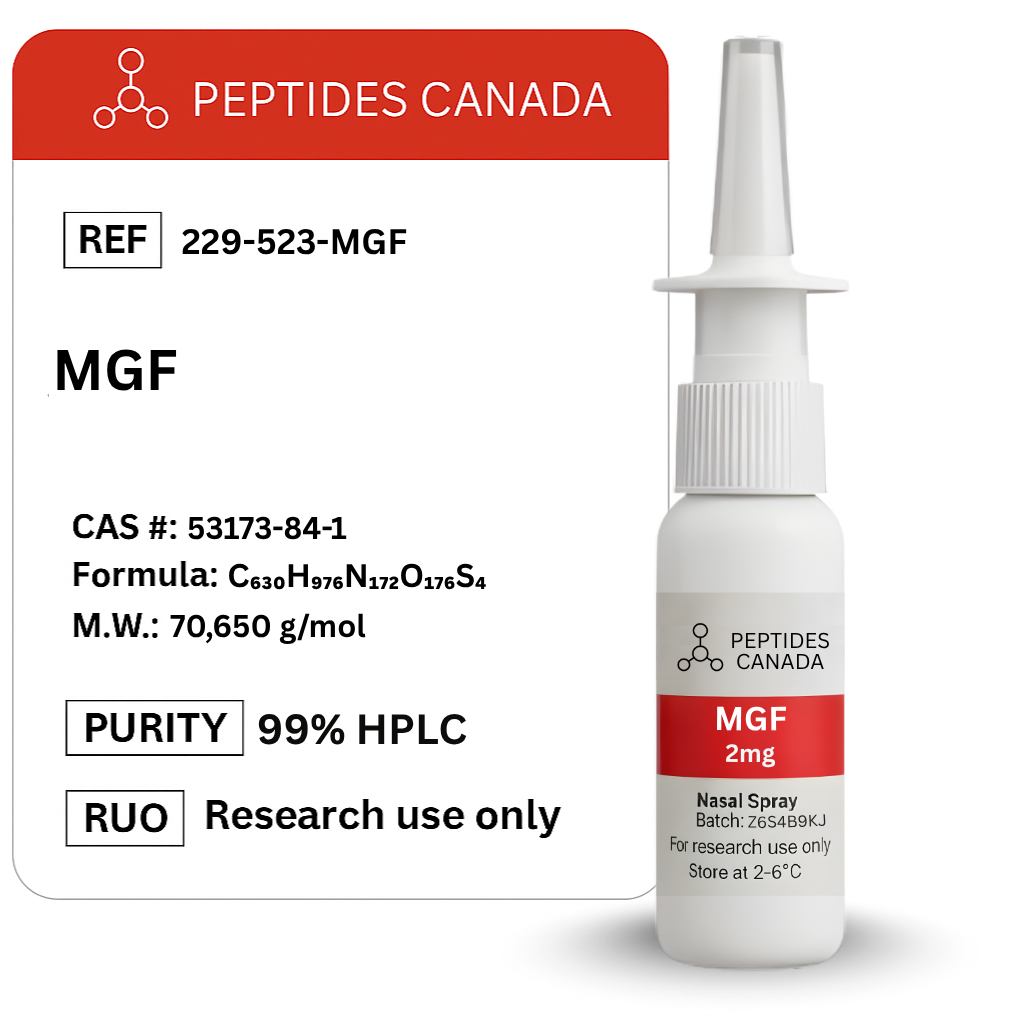 Mechano Growth Factor (MGF) is a naturally occurring splice variant of the insulin-like growth factor-1 (IGF-1) gene, expressed in response to mechanical stress or muscle damage. It is a synthetic peptide corresponding to the unique E-domain of the IGF-1 gene transcript, comprising 24 amino acids. Researchers suggest that MGF may play a role in the activation and proliferation of satellite cells, which are key to muscle repair and regeneration processes in experimental systems.